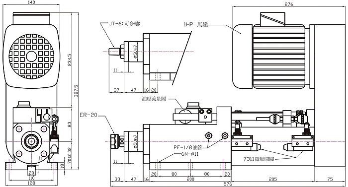 4. 油压推送主轴进刀,主轴滑套进刀,不用装置滑台机构。主轴动作:快进、工进、快退。